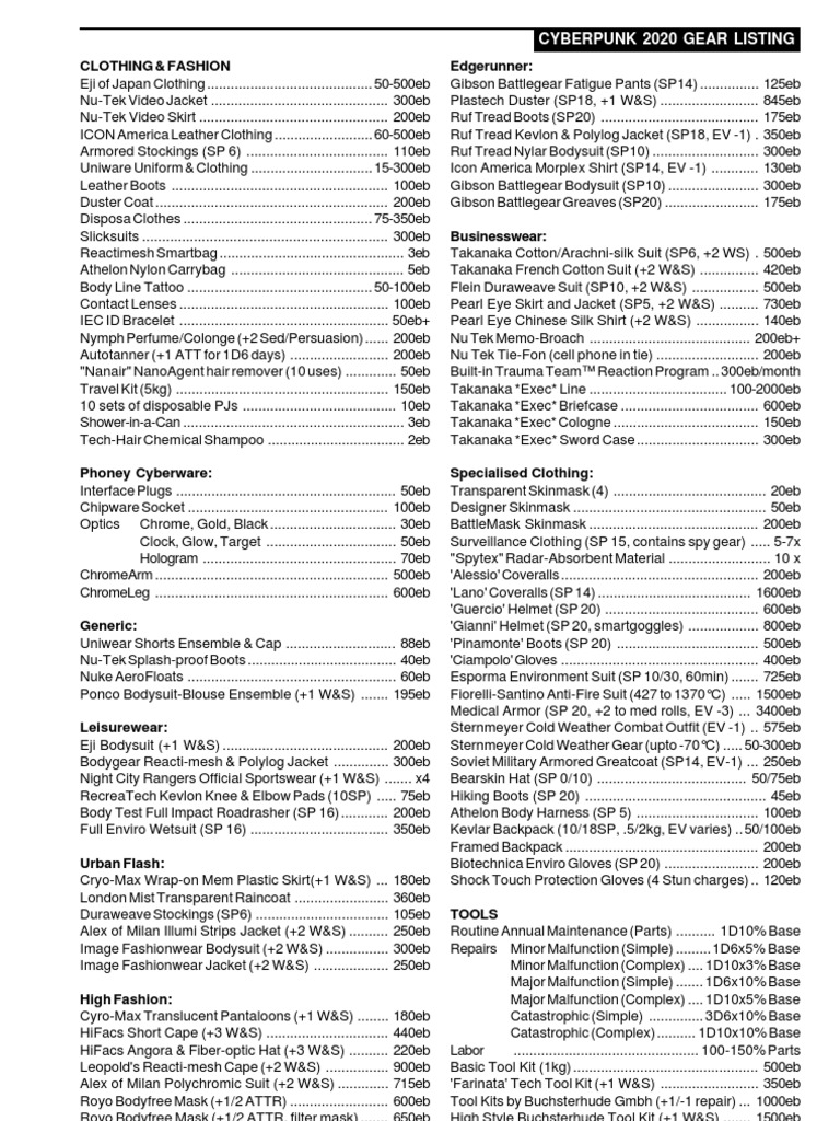 Cyberpunk 2020 Gear Listing